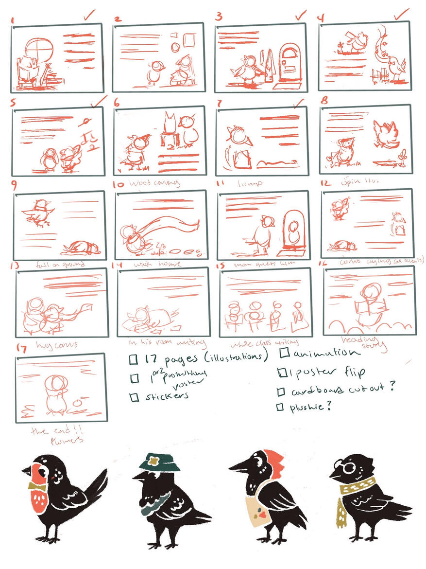 For this project I illustrated a children’s book, designed posters, and created stickers. The book is a short story about a crow named Corvus who is having trouble finding his talent for school.